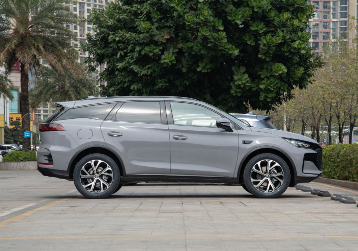 再来看新车的车身侧面部分,870mm的车长与2820mm轴距为唐DM-i塑造出修长的侧身比例。车顶弧线营造悬浮效果,分段式腰线从前翼子板延伸至尾灯,配合前低后高的俯冲姿态,兼具动感与稳重。轮眉与侧裙的隆起筋线强化肌肉感,而19英寸熏黑多辐轮毂(顶配)则进一步突出力量美学。值得注意的是,新车风阻系数优化至0.33Cd,较老款降低3%,这对续航提升具有实际贡献。