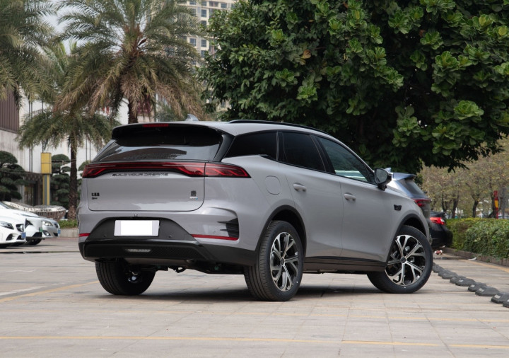 再来看车尾部分,贯穿式尾灯组延续“中国结”设计元素,内部LED示宽灯点亮后辨识度极高。车顶扰流板与高位刹车灯的组合强化运动属性,尾门筋线与内凹牌照框形成立体光影效果。后包围两侧的装饰性导流槽与前脸呼应,而隐藏式排气布局则保持尾部简洁,符合新能源车型的设计趋势。