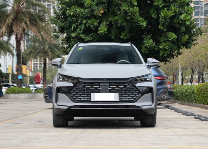 我们首先来看新车的外观设计方面,新款唐DM-i前脸采用标志性的大嘴式格栅,内部鳞片状结构结合熏黑车标,形成强烈的视觉冲击力。矩阵式LED大灯组通过熏黑镀铬饰条贯穿,拉伸横向视觉宽度的同时,赋予车头“龙目”般的锐利神态。格栅两侧的垂直导流槽并非装饰,其空气动力学设计可降低5%的风阻系数。底部扁平进气口采用蜂窝网格点缀,与黑化轮毂、侧裙筋线共同构成“暗夜龙吟”主题套件,满足年轻用户对运动审美的需求。