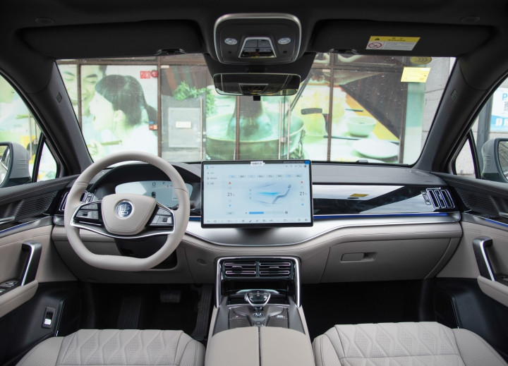 进入车内,可以看到新车内饰依旧是家族式造型,中控部分配备了15.6英寸旋转屏搭载DiLink 5.0系统,语音识别准确率达98%,支持分屏显示与HUD投影。并且电子怀挡取代传统档把,释放出50W风冷无线充电区与开放式储物格,扶手箱内置车载冰箱(支持-6℃至50℃温控)。材质方面,未央灰配色版本采用NAPPA真皮座椅,菱形缝线与金属饰板交织,搭配“灵境清幽”香氛系统,营造轻奢氛围。空间方面,新车第二排腿部空间达980mm(座椅调至最后),第三排适合短途乘坐;但第三排未配备充电接口稍显遗憾。