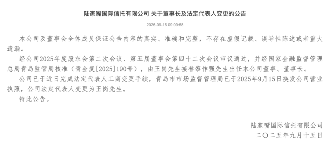 9月16日,注册于青岛的陆家嘴国际信托有限公司(以下简称“陆家嘴信托”)发布公告,宣布董事长及法定代表人发生变更。
